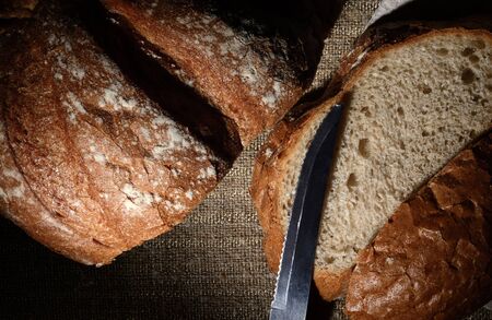 Wheat loaf. Slicing a loaf on a cutting board. Food, bakery products. Top view