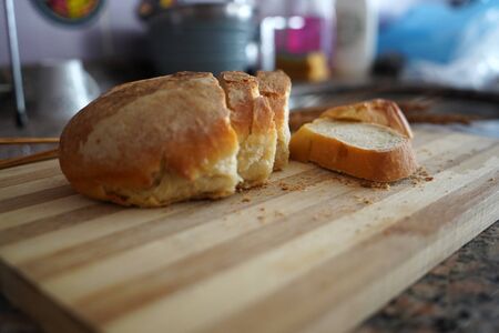 Homemade bread loaf sliced on wood tray. Selective focus