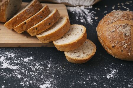 Sliced homemade white wheat bread with wheat flour on old black oven tray as background. Top view