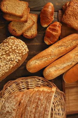 Varied bread still life over dark wood background