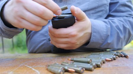 Hands hold a gun while preparing cartridges for a shooting activity indoors