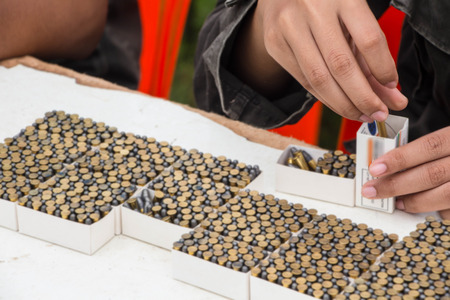 Shooting range. A lot of empty bullet cartridgesare in the box.
