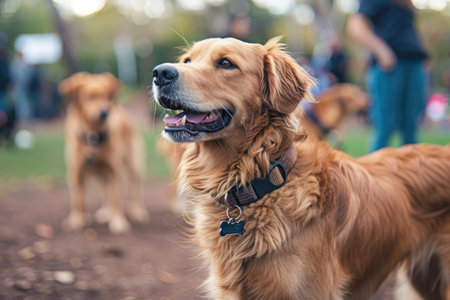 Attentive Tan and Black Dog with a Bone-Shaped Collar Enjoying a Sunny Day at the Bustling Dog Park AI
