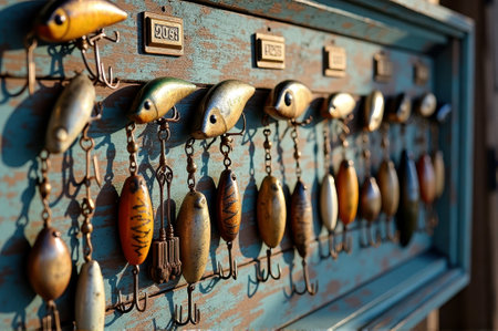 Vintage fishing lures collection on rustic wooden display board. That the image is generated using AI.