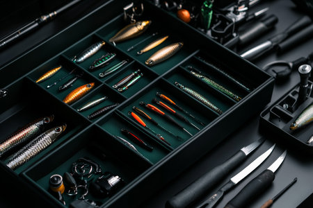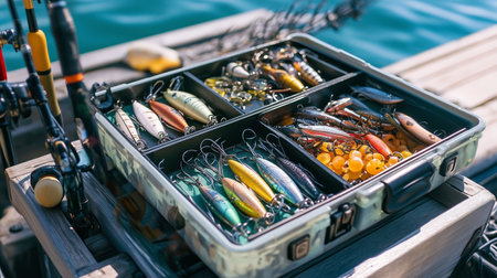 Colorful fishing lures arranged meticulously in a tackle box on a sunny day by the dock at the lake