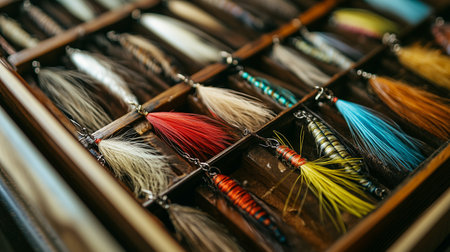 Colorful fishing lures neatly arranged in a wooden tackle box ready for a day of fishing in a serene lakeside setting