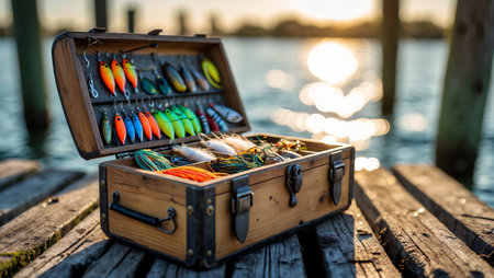 Fishing tackle box with colorful lures resting on a wooden pier at sunset by the water