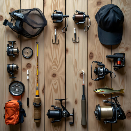 fishing tools and equipment flat lay AI Generated
