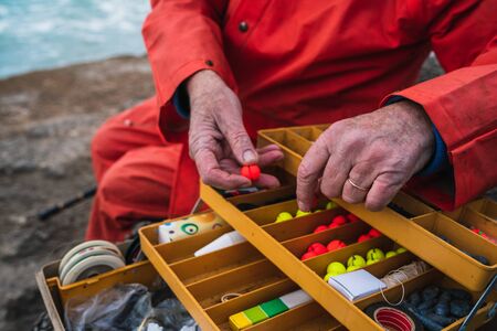Close-up of a fisherman putting on bait with fishing equipment box. Fishing and sport concept.