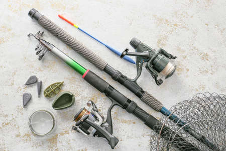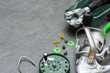 Fishing rod with reel on gray flat lay background with copy space. Fishing accessories on the table.