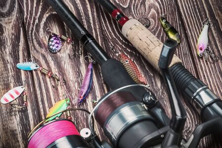 Fishing tackle - fishing rod, fishing line, hooks and lures on wooden background