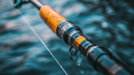 A fishing rod is prominently displayed with water droplets glistening on its handle. The tranquil water surface reflects the calming atmosphere of the outdoor activity.