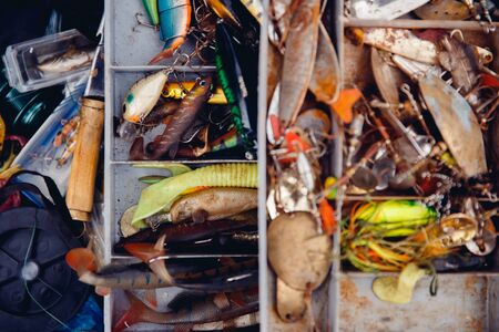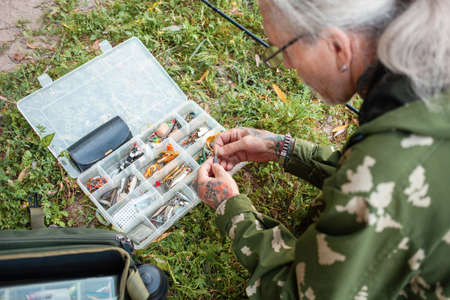Fishing gear in the organizer, box. Various baits for predatory fish. Artificial fish for hook. Weights. Fishing hobbies, outdoor. elderly man