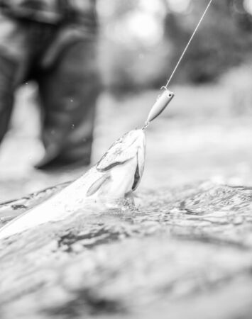 Freshwater fish on hook. Trout in water close up. Fishing hobby. Fishing activity. Fishing equipment. Wild nature. Fish in river. Gear and bait concept. Fisherman job is simple. Fins and scales.
