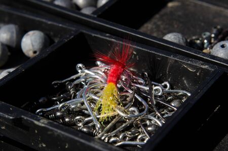Close up of hooks and angling accessories in a fishing box.