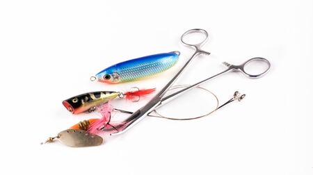 Kiev, Ukraine- November 10, 2019. Fishing bait tackle and baubles for fishing on a white background, wobbler.