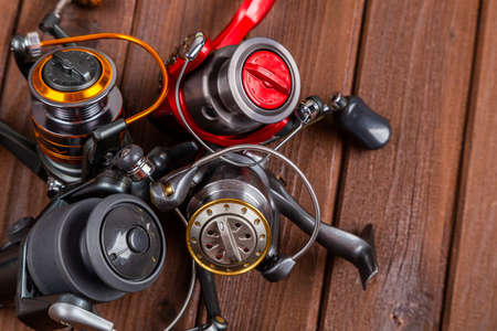 Different fishing tacles with lures and reels on wooden brown background with place for text. Design for advertisment and publishing.