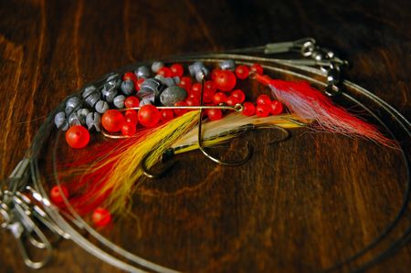 Accessories for fishing on the background of wood.