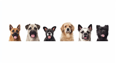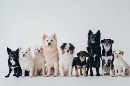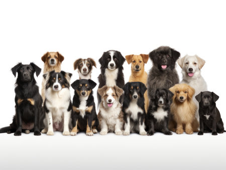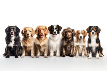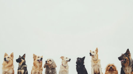 A diverse gathering of dogs sits together in a row, showing different breeds and sizes with a blank background for added design flexibility.