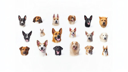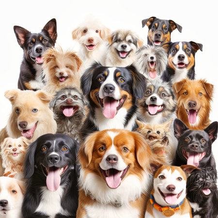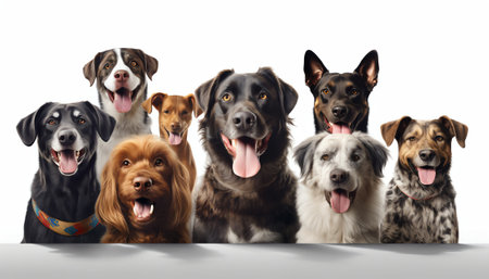 A group of joyful dogs of different breeds and sizes sits together against a blank background, making them ideal for added text.