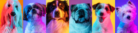 Art collage made of funny dogs different breeds on multicolored studio background in neon light