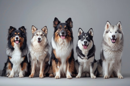 Different dog breeds and sizes sit side by side in a studio, showcasing their friendly demeanor against a plain background.