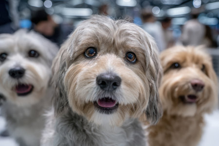 Three friendly dogs are facing the camera, displaying their unique fur and bright expressions in a lively venue.