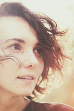Young woman tourist enjoying sunset. Portrait of the beautiful girl close-up, the wind fluttering hair.