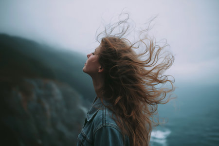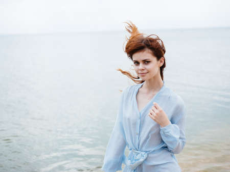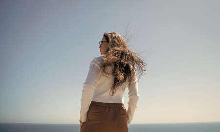 Her hair is flowing in the wind. Woman with long hair stand at sea. Stylish girl with wavy hairstyle