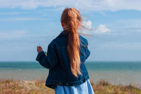 Adorable little girl in denim jacket back view on a hill with sea landscape view. Stylish child with long blonde hair on countryside cloudy sky background. Outdoor walking rural road trip faceless.