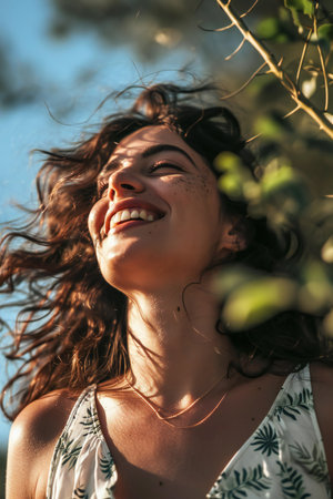 Happy joyful smiling woman spending her free time outside enjoying beautiful summertime weather.