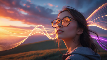 Woman in glasses gazing thoughtfully at sunset with glowing abstract light waves surrounding her. Vibrant colors and serene outdoor atmosphere.