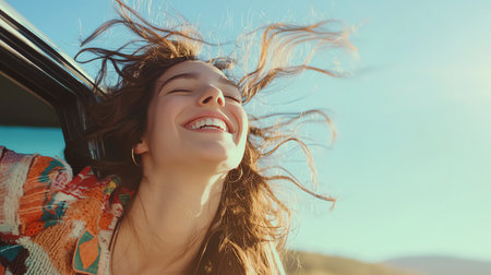 Joyful young woman smiling under a clear sky with flowing hair capturing a moment of freedom