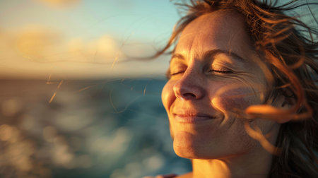 A woman stands with arms wide open, smiling towards the sun. The photo presents a medium shot of her against the ocean. Warm sunlight bathes the scene. Soft colors and a shallow depth of field create a peaceful atmosphere. Ideal for conveying joy and serenity in various visual projects.