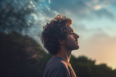 A young man with curly hair and a yellow bandana stands outdoors, smiling dreamily under a dramatic cloudy sky, capturing a moment of pure joy and tranquility.