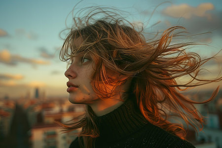 Depicting a woman with hair in wind on rooftop in barcelona, high quality, high resolution