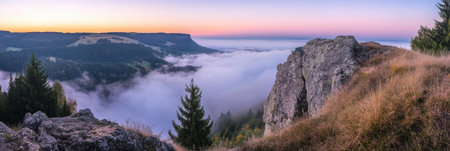 A beautiful sunrise casts warm colors over a misty valley filled with trees and rocky cliffs early in the morning.