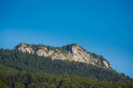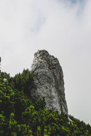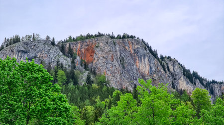 Scenic view on mount Rote Wand near Mixnitz in Styria, Austria. Morning landscape of alpine meadow and rock formation in the valley of Grazer Bergland in Styria, Austria. Overcast