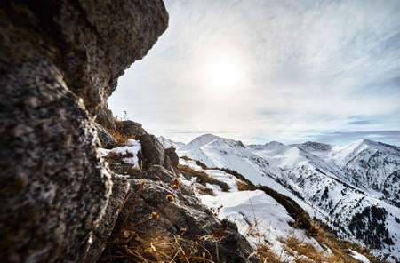 Beautiful Minimalism landscape at high mountains with snow against blue sky at winter time in Kazakhstan