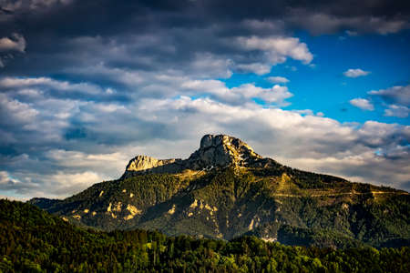 Beautiful sunrise landscape with sharp mountain peak,blue sky,illuminated clouds by the sun at Transylvania,Romania