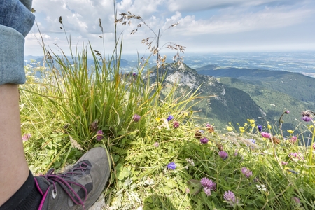 Rauschberghof, Germany - September 18, 2018: Tourist on observation deck in the mountains on a summer day. Beautiful mountains landcape