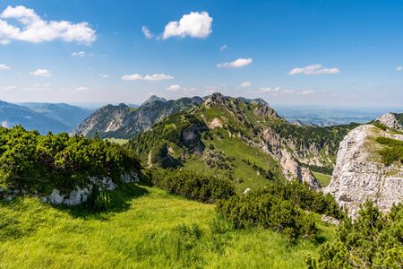 Maly Rozsutec hill summit with stones in Mala Fatra mountains in Slovakia with Terchova village and hills on the background