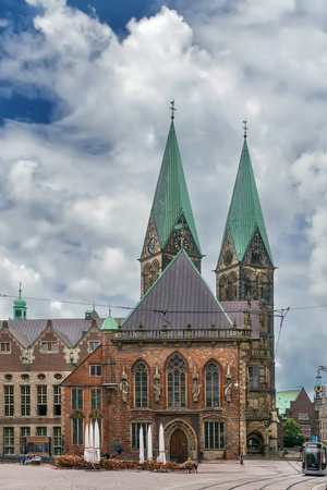 Bremen, Germany - Facade of city cathedral in old town, towers of the historical dom church, sunny day