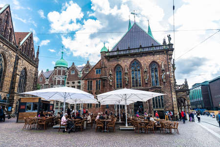 Bremen, Germany - August 19, 2019: Bremer Marktplatz (Bremen Market Square), the Bremen City Hall and a terrace of a bar with people around in Bremen, Germany