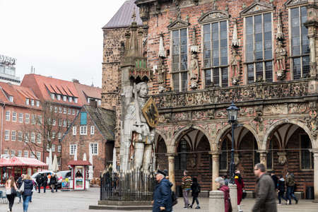 Bremen, Germany. The Bremen Roland, a statue of Roland (a Frankish military leader under Charlemagne) erected in 1404. Market square (Rathausplatz)