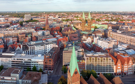 Bremen, Germany. Aerial View on Historical Center of Bremen, Marktplatz at Sunrise.