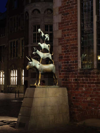 The sculpture of the Bremen town musicians by night. Central square of Bremen