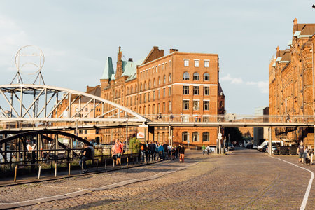 Hamburg, Germany - Mar 2018: Iconic Brooksbrucke bridge over Zollkanal in Hafencity with beautiful German architecure in background