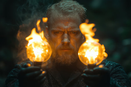 A man holds two fire lamps in front of him. An atmosphere of anxiety and expectation.
