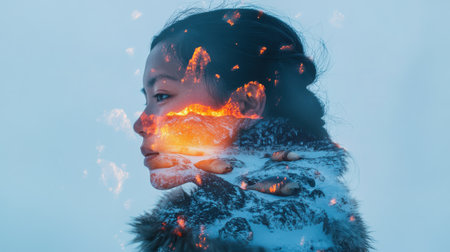 A beautiful double exposure captures the profile of a woman intertwined with a dramatic volcanic landscape, showcasing fiery colors and icy terrain. Nature and humanity blend harmoniously.